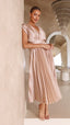 The Amelisse Dress is a masterstroke in modern refinement. Designed with a deep draped V-neckline and an umbrella-pleated skirt, it brings together architectural shape and graceful motion. A high waistline enhances the silhouette with soft structure, while a side cut-out detail offers a contemporary edge. Finished with a hidden rear zip, The Amelisse delivers statement elegance — designed for moments that deserve to be remembered.