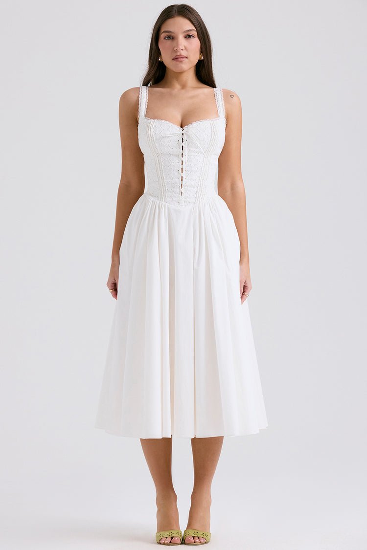 The Célina Dress is the essence of warm-weather sophistication. Crafted from a stretch cotton-rich fabric and delicate broderie anglais, it balances structure and grace. A sweetheart neckline trimmed with lace sets the tone, leading to a lace-up front that draws the waist in with effortless allure. The gathered waist flows into a voluminous midi skirt, making it a go-to for sun-drenched celebrations and serene escapes.