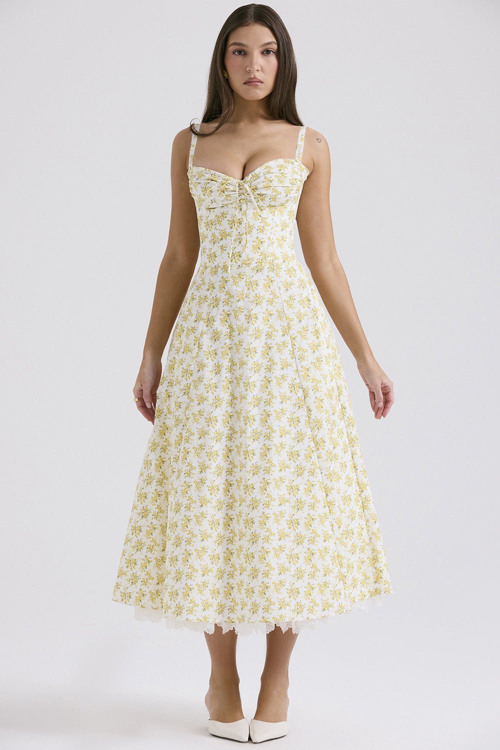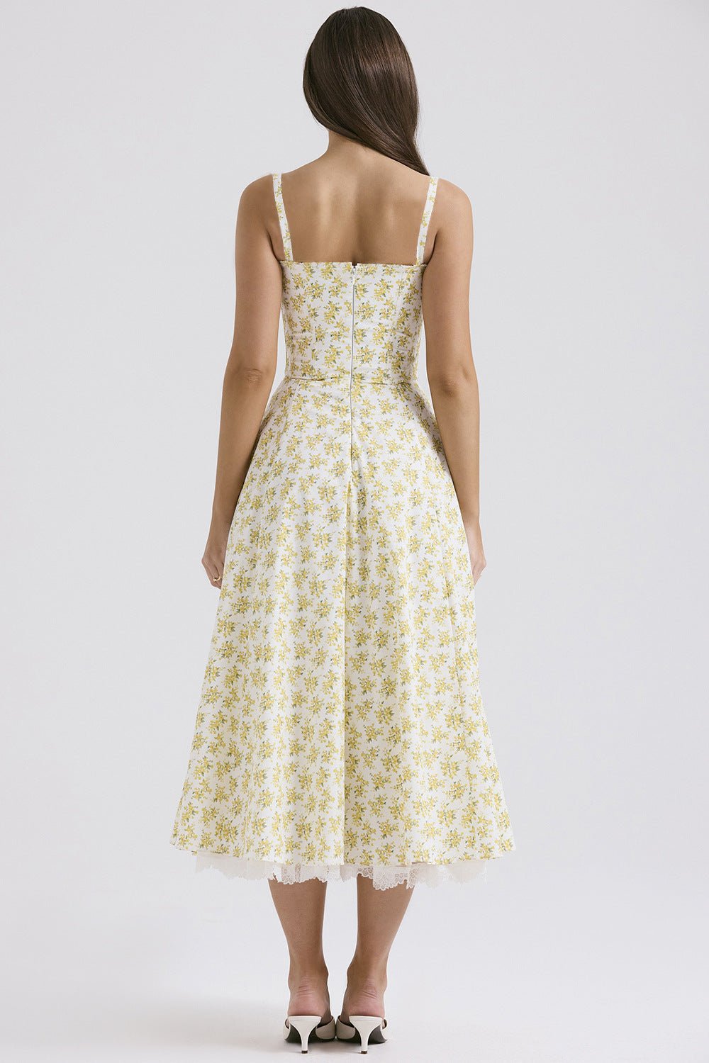 The Élodie Dress captures the charm of garden moments and the elegance of vintage silhouettes. Crafted from a stretch cotton-rich fabric printed with delicate florals, it sculpts the waist with a corseted bodice and softly gathered bust. The lace-trimmed hemline and tulle underskirt add volume and movement, while hidden pockets and full lining ensure everyday ease. Finished with digital printing to minimize water waste, it’s thoughtful in every detail — a celebration of beauty, comfort, and conscious design.
