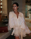 The Evienne Dress is a celebration of vintage-inspired confidence. Crafted in a champagne-toned fabric with a soft sheen, it features a sculpted bodice with padded shoulders that bring intentional structure and poise. A detachable belt cinches the waist before falling into a ruffled mini skirt that moves with graceful energy. Finished with pearl-gold button accents at the neckline and cuffs, it’s the perfect balance of polished femininity and playful charm.