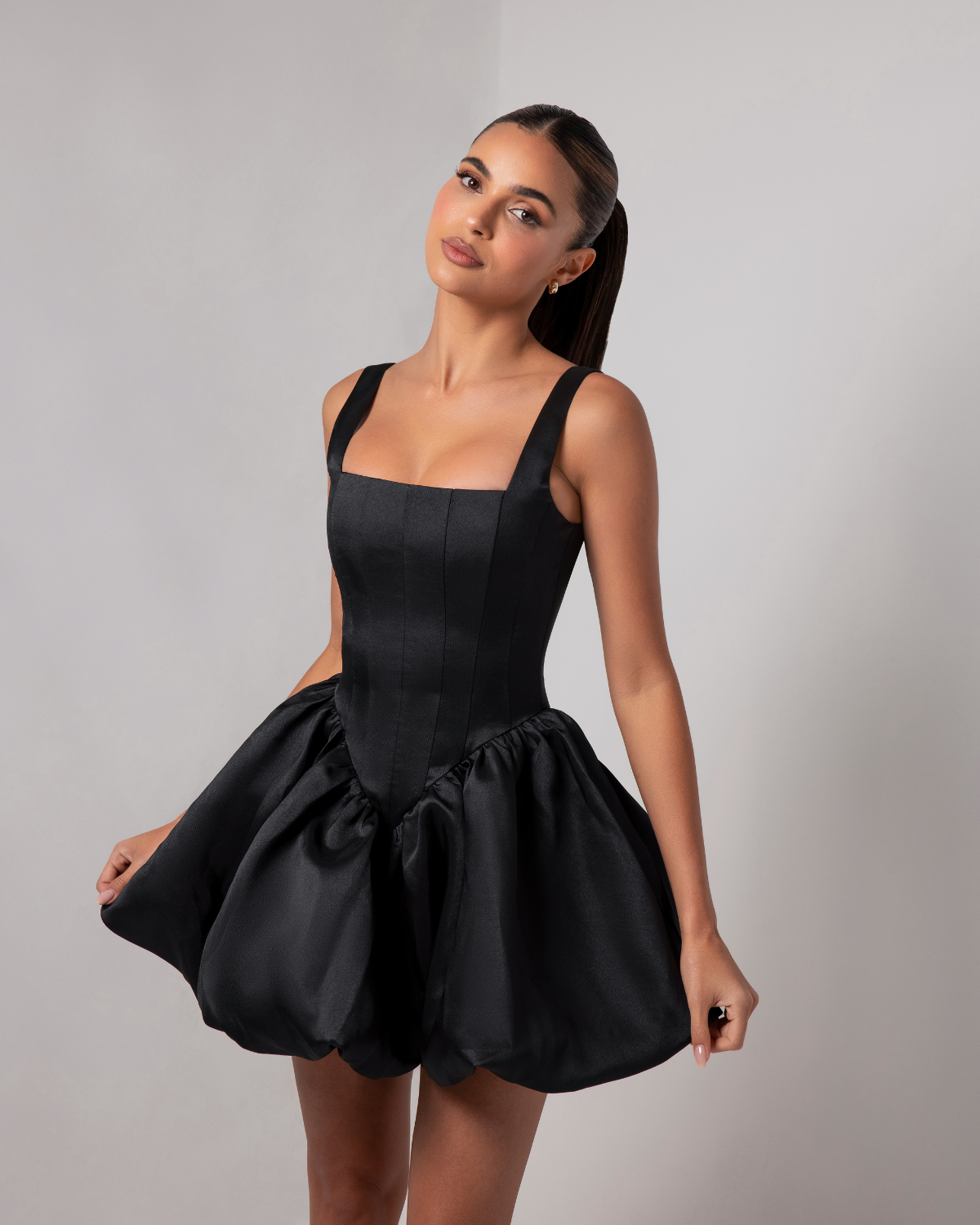 The Saphina Dress is a statement in sculpted glamour. Designed with a structured bodice that defines and supports, it cinches the waist to enhance the hourglass silhouette with refined precision. A voluminous bubble skirt adds unexpected drama and modern texture, striking the perfect balance between elegance and edge. Ideal for special occasions, this mini silhouette captivates with every step — a true celebration of bold femininity.