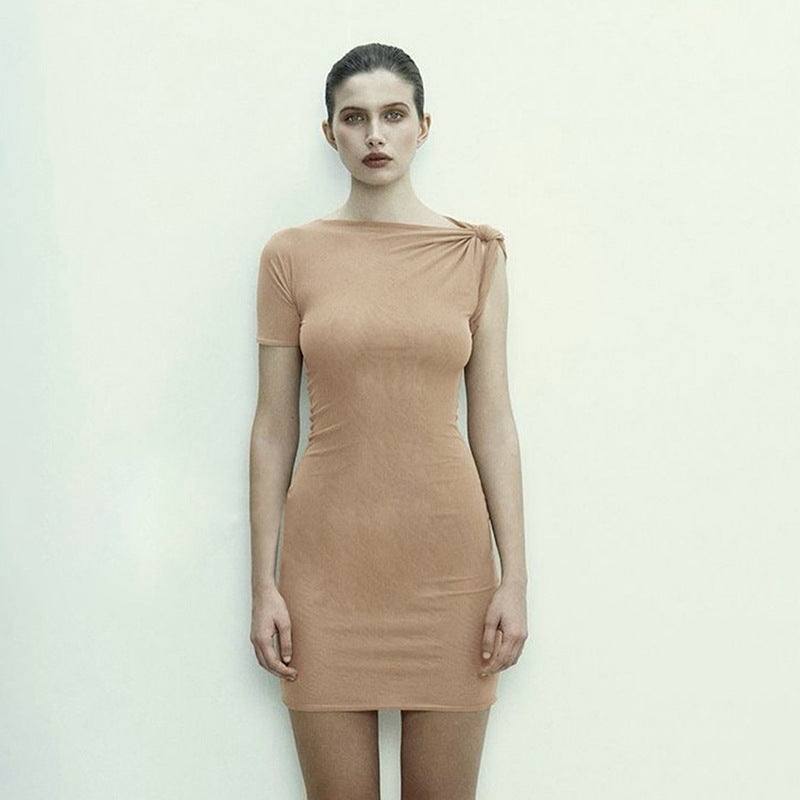 The Sorelle Dress is a statement in sculptural minimalism. Cut from sueded stretch fabric with a buttery-soft, brushed texture, it contours the body with ease while offering subtle structure. A twisted, off-the-shoulder neckline frames the collarbone, while a single short sleeve and looped twist detail add directional edge. Designed for movement, intimacy, and bold simplicity, this mini is made to hold the gaze — effortlessly.